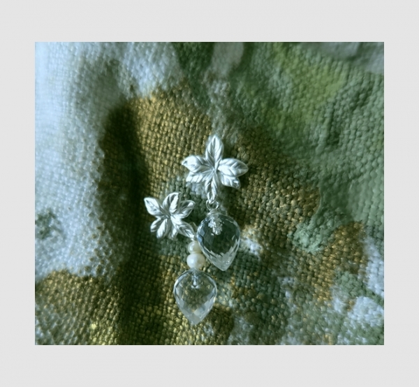 eine zauberhafte Silberblüte mit Geschliffenen Bergkristallen in Tropfenform....der eine Stecker ist durch 2 kleine Saatperlen 0,5 cm länger als der andere. Am Ohr ein spannendes Duo.