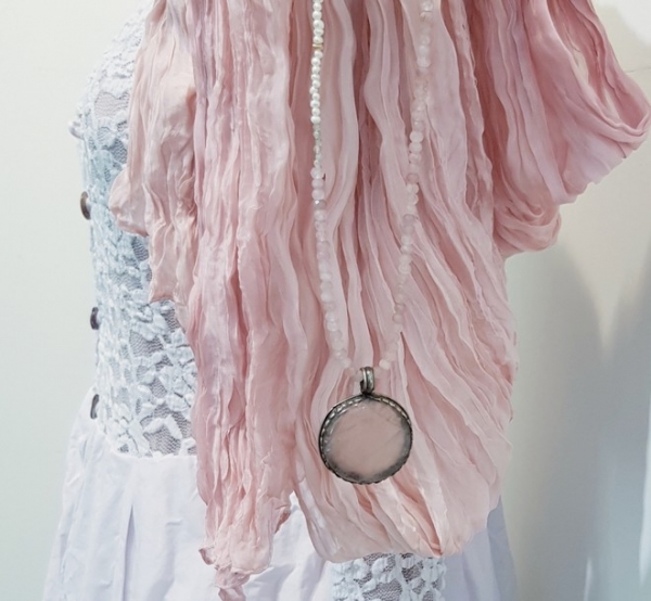 ein wunderschöner Hingucker auf dieser Kombination.....ein in Silber gefasster, geeister ( entsteht durch Kälte) Rosenquarz..... die Kälte läst ihn matt wirken. Sehr apart. das Collier besteht aus kleinen perlen, Mondsteinen und Rosenquarzen.