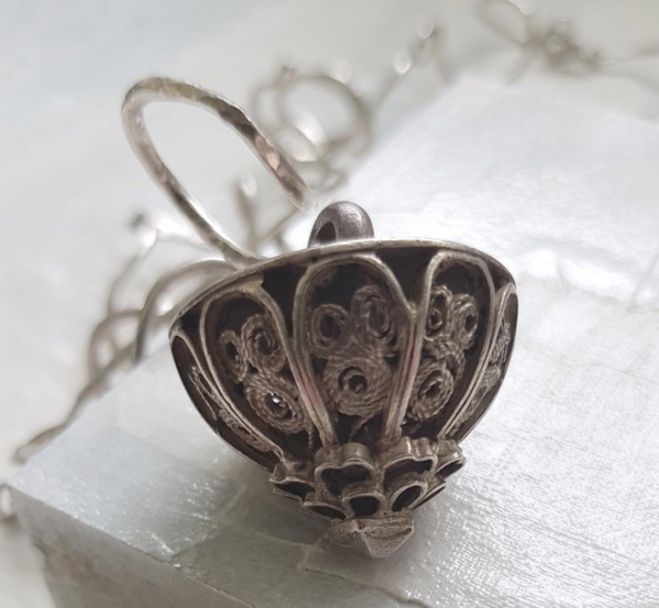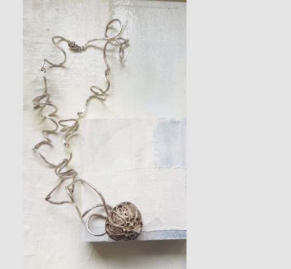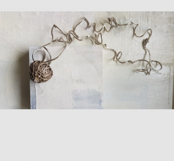 Modern trifft auf sehr alt…. Das Collier ist aus 925 er Silberdraht gewickelt und gehämmert. Durch Verbindungsglieder zur Beweglichkeit animiert. Ein Collier, das immer anders fällt. Der Silberknopf aus dem 18. Jahrhundert lässt sich mit etwas Geduld aus der Kette drehen, dann kann man das Schmuckstück auch pur tragen.