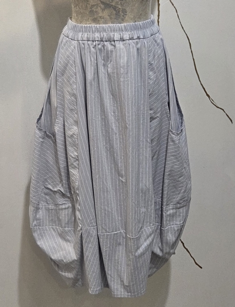 hier in einem Streifenstoff in einem zarten blau mit weiß, der fester, elastisch und pflegeleichtzugleich ist. Dieser Rock ist mit Gummizug gearbeitet, bauchig zum Saum hin geschnitten und mit seitlichen großen Taschen gearbeitet. Edel und sportiv zugleich.