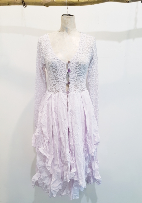 Das Oberteil wird durch kleine Knöpfe auf Figur gebracht.....der Rockbereich ist zipfelig, asymetrisch geschnitten.