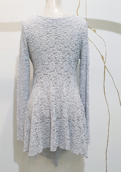 hier in einer silberfarbenen Spitze. Dieser Mantel ist im Vorderteil durchgängig Silouhette. Verschlossen wird er durch 3 kleine Knöpfchen