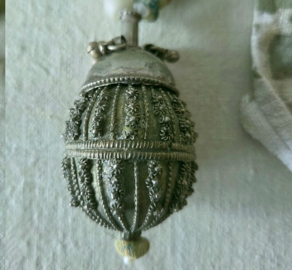 aus Aquamarinen, die matt geschliffen wurden und über hundert Jahre alten afrikanischen Glasperlen. Der Hingucker ist aus altem Silber, handgefertigt im Jemen, sowie Silberteile aus Afrika......ein absolutes Einzelstück.