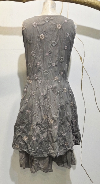 hier in einem wunderschön bestickten Blumenstoff in der farbe ASH. Die zauberhaften Blüten sind in graugrün und graustichigem rose entsprechend passend. Das Kleid ist figurbetont aber ein Schlupfkleid.
