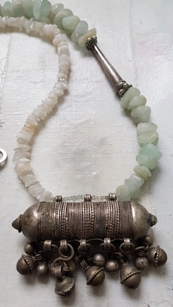 aus meiner Werkstatt....... da ich antike asiatische Elemente liebe, hier ein nepalesicher Silber HIrzmit weiteren Silberelementen, zartgrünen Aquamarinen und Mondsteinen....Ein Traumteil für Damen die außergewöhnlichen Schmuck lieben. Ein Statement- Schmuckstück.