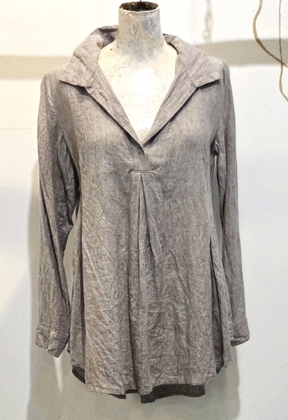 hier in einem sandfarbenen Leinen. Kleine Perlmuttknöpfe zieren die halbe Knopfleiste.Die Bluse ist vorne kürzer als im Rückenteil.